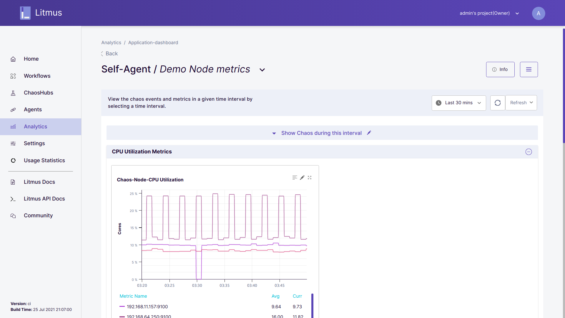 • View chaos metric info: For the particular graph, if you want to view the chaos scenario -related information in the table then you may first expand the graph and hover over the specific chaos event to view all its chaos scenario -related information.