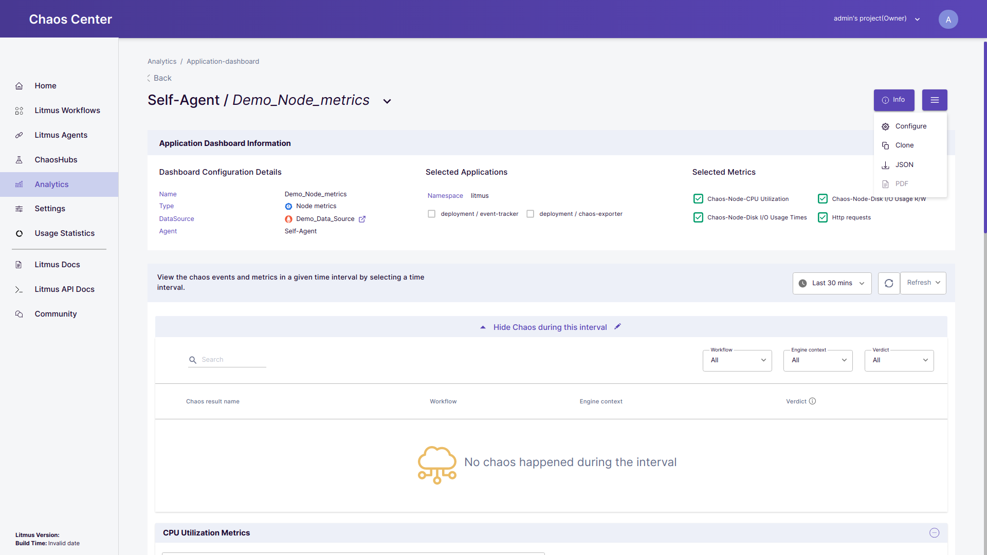 • Dashboard Info: All the dashboard meta-data (name, type, data source, chaos delegate ), selected applications and selected panels are displayed in this selection. To check on the data source connected with the dashboard click on the attached data source link. You may select/deselect the items listed in the selected applications and selected panels field to visualize the appropriate data.