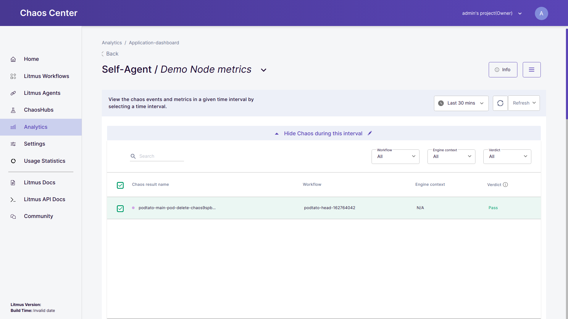 • Show chaos during this interval: Among all the chaos injections that have been scheduled by the user, chaos events that lie within the selected time interval are listed in form of a table. You may select/deselect the specific chaos events to visualize them on the graphs as an overlay for the chaos during. Please note that all the chaos events come along with the lasted verdict corresponding to the chaos scenario .